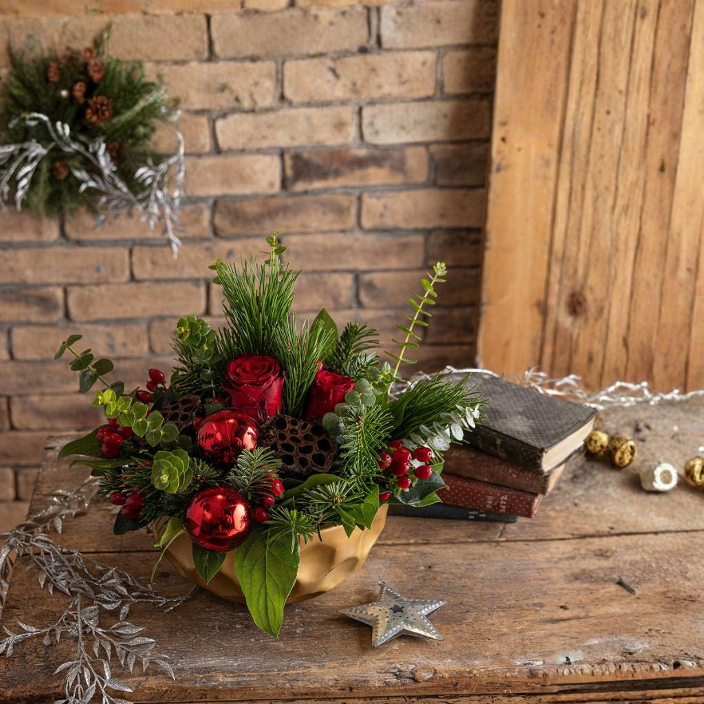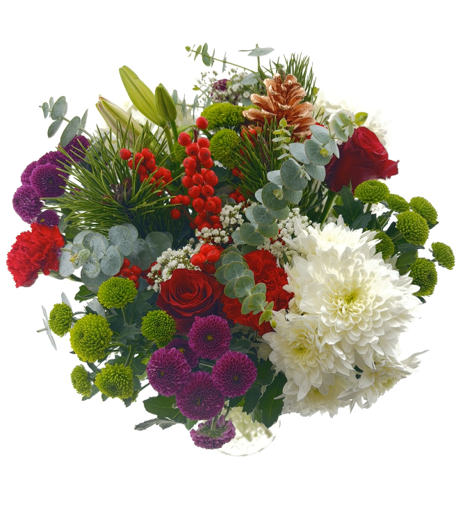 The bouquet is accented with red hypericum berries and rustic larchpole stems, creating a harmonious blend of festive reds, greens, and whites that embodies the spirit of Christmas. Perfect for decorating your home or gifting a loved one, this arrangement will bring warmth and elegance to your holiday celebrations.