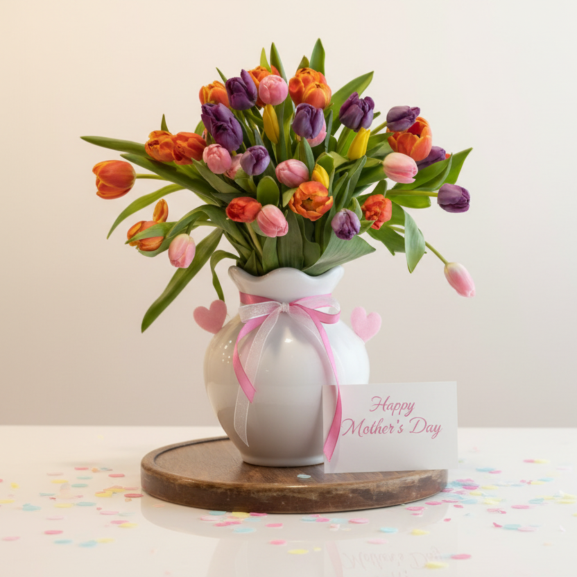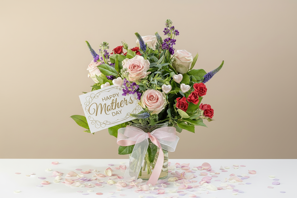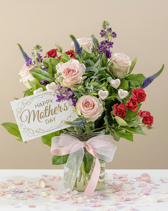 Celebrate Mother's Day with our enchanting Choice Blossoms bouquet, a delightful ensemble curated to honor the extraordinary mothers in your life. Immerse yourself in the beauty of the season as delicate pink roses, vibrant red rose sprays, and the soft fragrance of Mattioli stems and eucco cinieria weave together in harmony. Each bloom is a testament to the love and appreciation that fills our hearts on this special day.