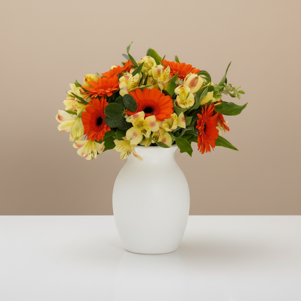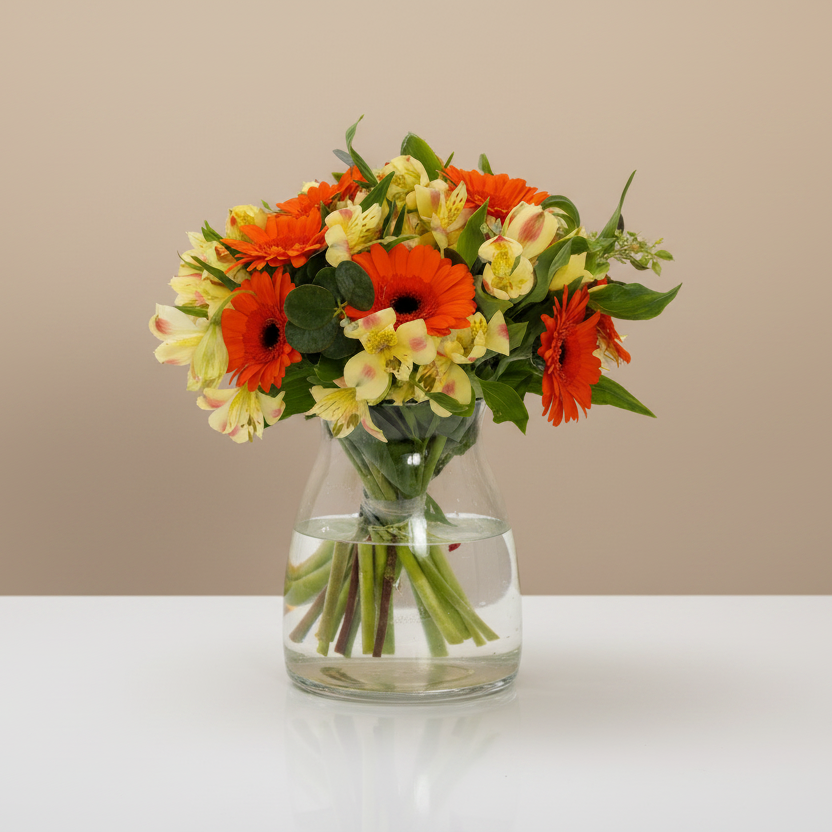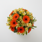 Sunny, spirited, and impossible to ignore, the Mini Me Orange bouquet brings warmth and energy to any space. Featuring a wonderful vibrant orange Germini (mini gerbera daisy) with a full, cheerful bloom, paired with incredibly long-lasting yellow alstroemeria for a bright contrast, and finished with Irish eucalyptus (euco) that looks great and smells divine.