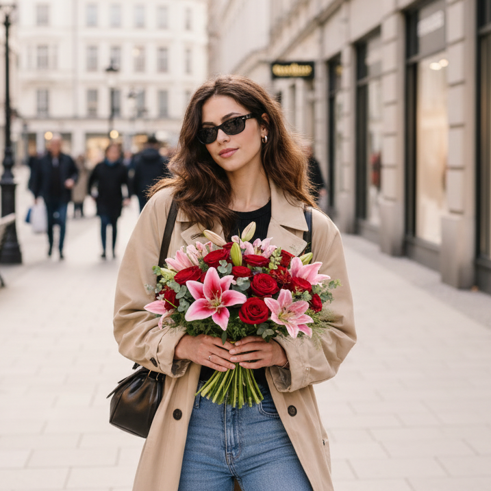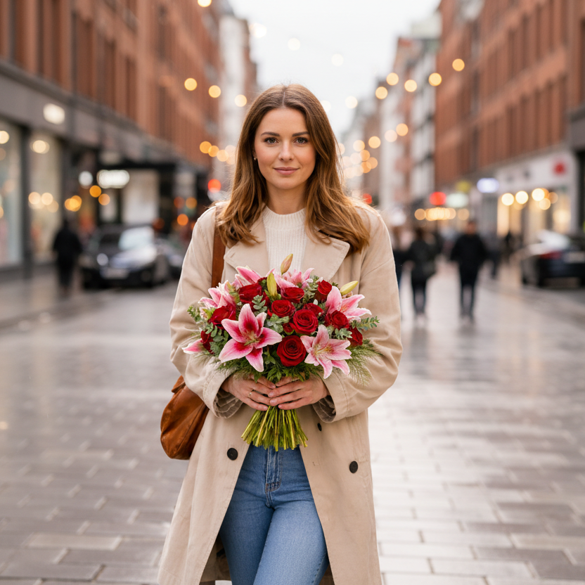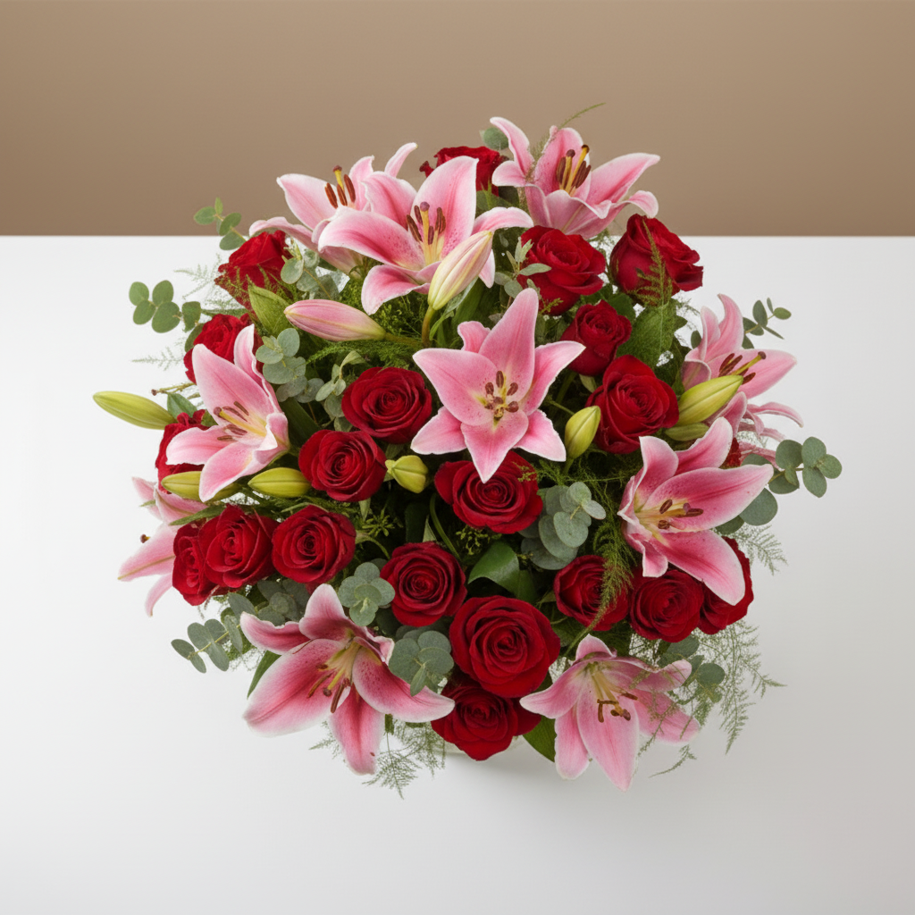 Bold romance meets soft elegance in the Rose & Lily Red bouquet. At its heart stands a stunning Ecuadorian red rose (60cm) – known for its large head, rich velvety color, and exceptional vase life. Paired with the best quality Qualy pink lily, this arrangement offers a beautiful contrast between passionate red and gentle pink.