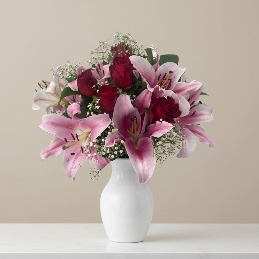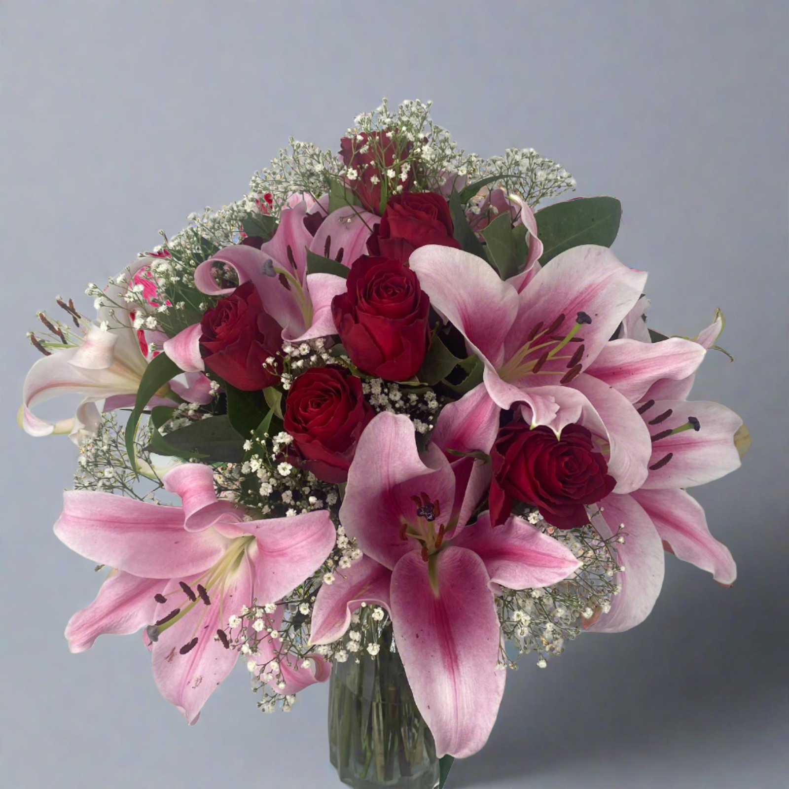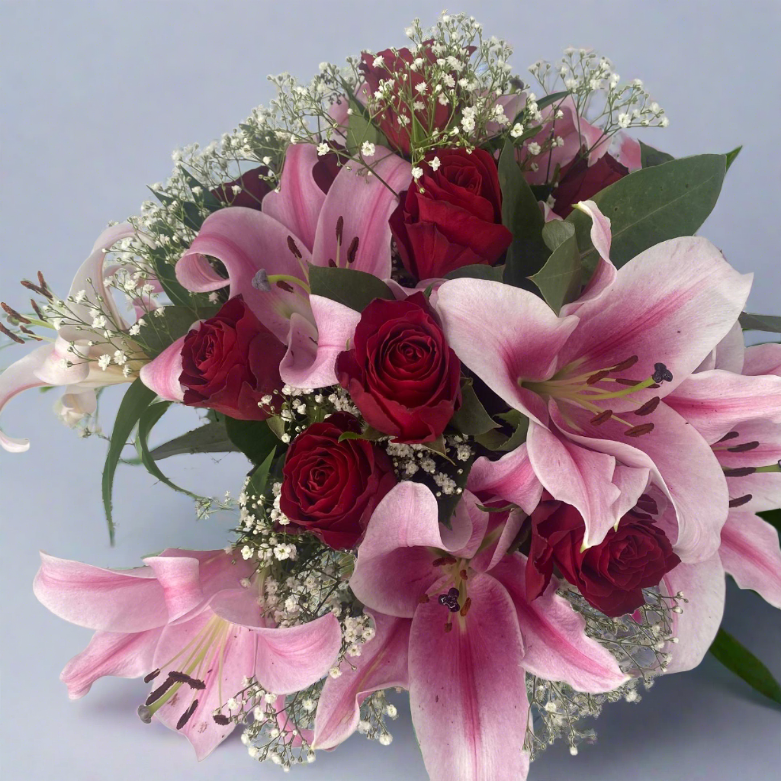 Experience timeless romance with our exquisite Rose & Lily Red Bouquet - a passionate symphony of velvety red roses and elegant lilies, handcrafted in Ireland for unforgettable moments.