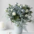 Embrace the enchantment of the season with our Christmas Frosty Flower Bouquet. This winter wonder features frosted Eryngium, snow-white roses, white Dianthus, frosted Asparagus, scented Eucalyptus, Pinus Strobus Christmas foliage, and silver baubles.