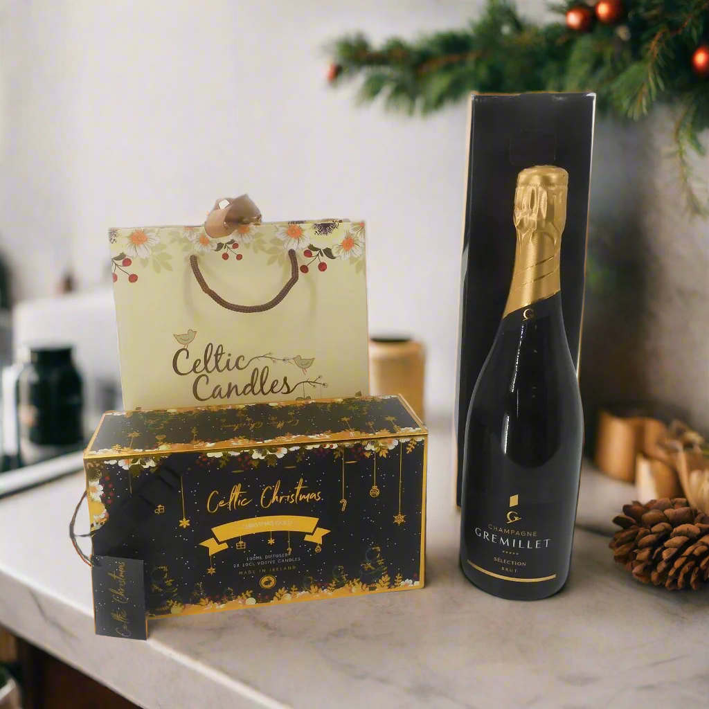 Experience the richness of the season with our Holiday Opulence Christmas gift set. Indulge in Gremillet champagne, bask in the festive glow of a Celtic Christmas candle set, and enjoy the subtle ambiance created by a scented diffuser.