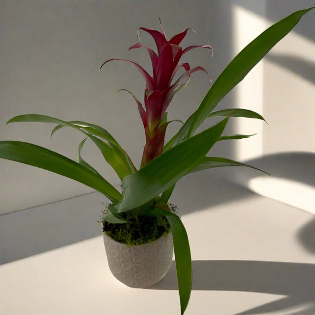 Introducing the Guzmania 'Scarant Star' Plant, the ultimate eye-catcher for your indoor jungle! Famous for its spectacular, long-lasting bright red bracts, this bromeliad delivers a stunning pop of tropical color with minimal effort. It arrives perfectly paired with a modern ceramic pot, ready to instantly elevate your home or office decor.